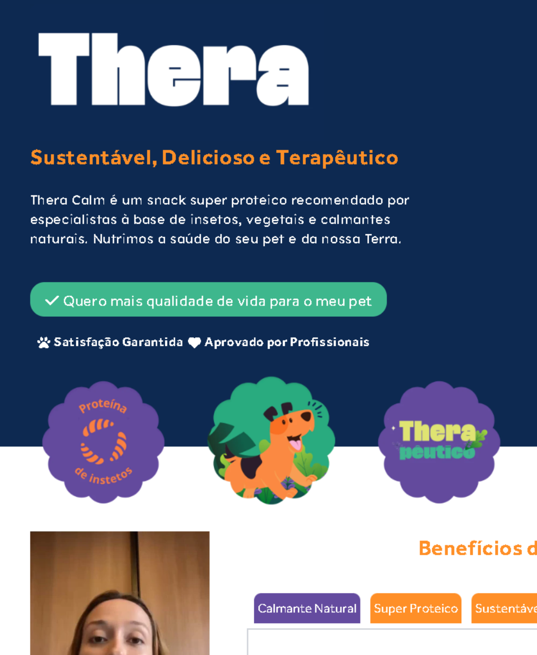Cliente Thera solicitou o desenvolvimento do site para divulgar Thera Calm, snack proteico com insetos, vegetais e calmantes naturais, promovendo saúde pet e sustentabilidade ambiental.